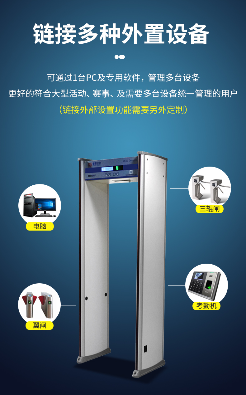 14、網絡管理(選配):預留通訊接口,可以與電腦、攝像頭、三軋輥等連接,監控、設計探測情況,調整安檢門參數