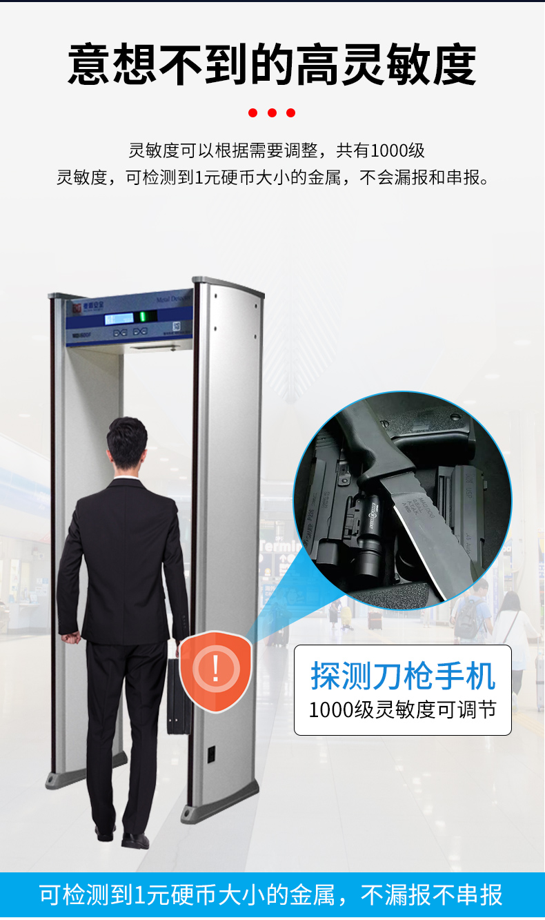 1、探測精度:最高靈敏度在門的正中間可以檢測到一根大頭針(或者1/2)回型針;不會漏報和串報;可排除皮帶扣、皮鞋、文胸等物品的影響;可檢測到150克以上的銅、鋁、鋅等金屬或者管制刀具和槍支